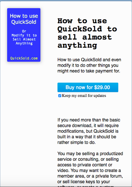 QuickSold allows you to have a product for sale quickly, and with little effort. Just download, FTP, and follow the prompts. It will allow you to create a login, setup all your site details and then enter in a product - all in a matter of minutes. But, it also gives you complete control if you want to customize the look, code, or experience.